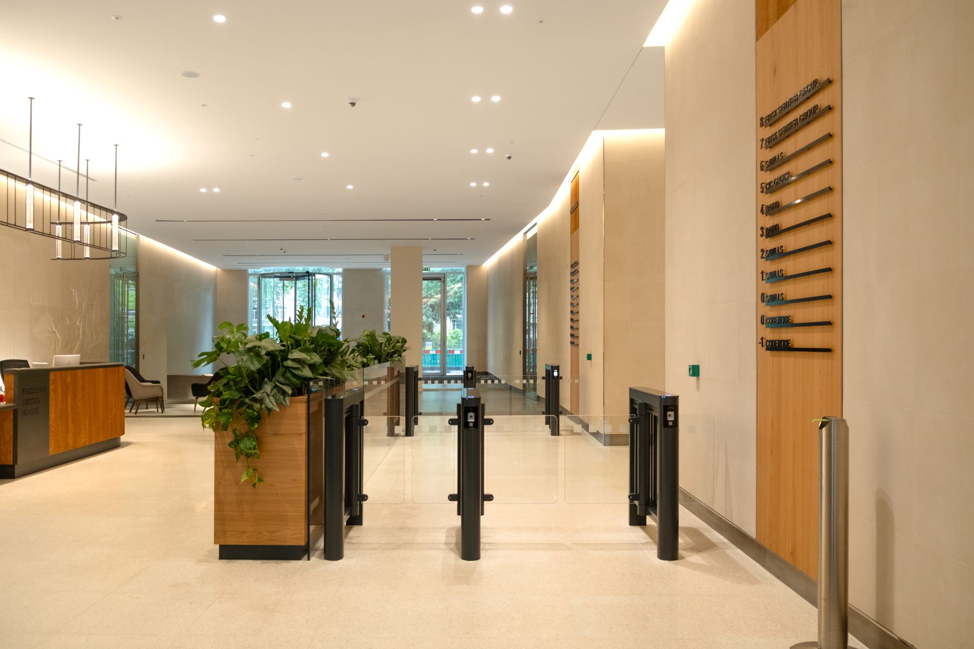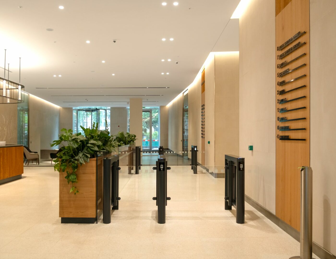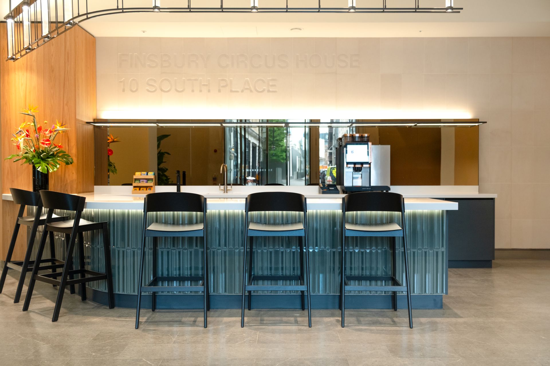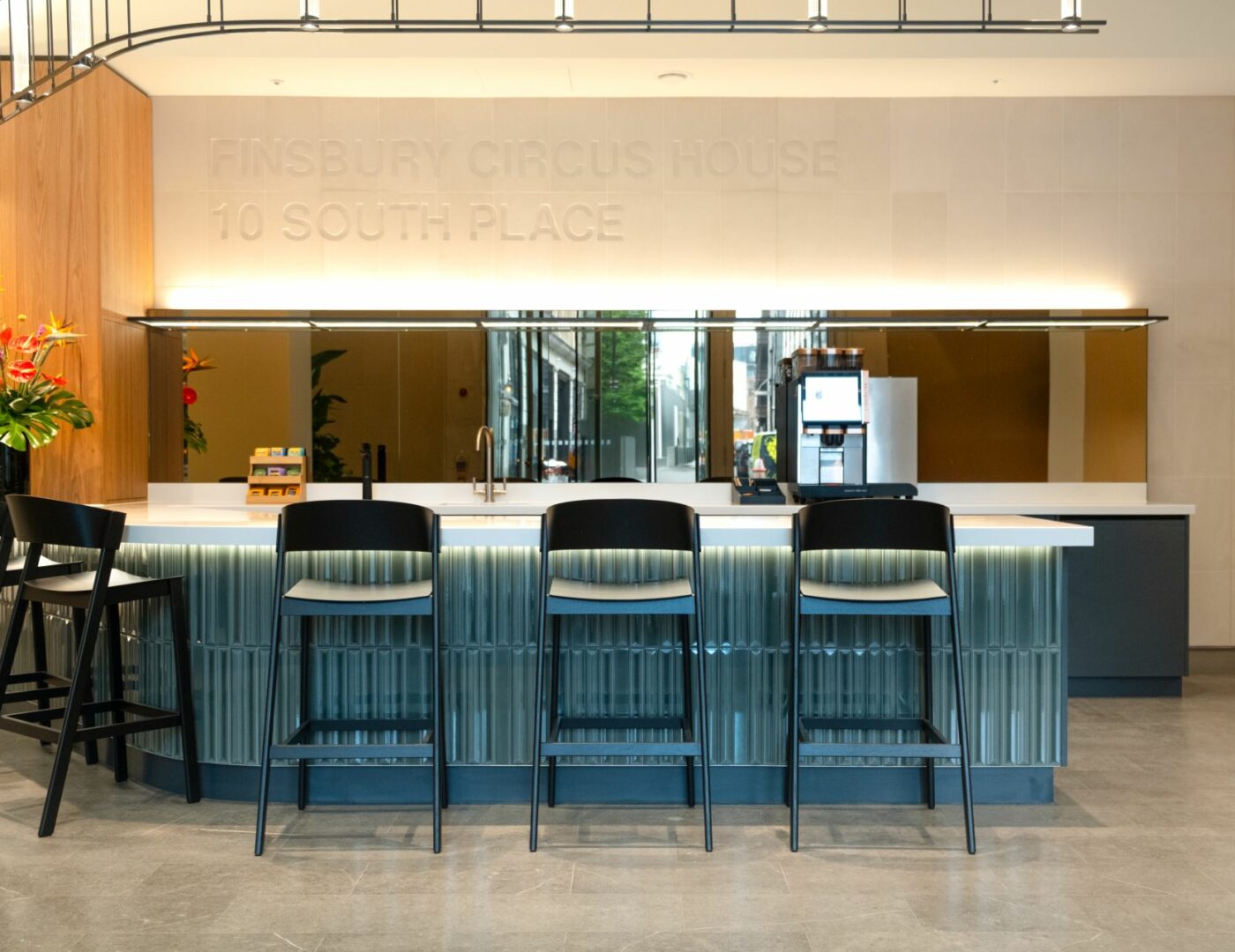Description: Refurbishment of the reception at Finsbury Circus House, this included new general, feature and concealed lighting which combined gives a welcoming aura that creates a pleasant atmosphere for clients, suppliers, staff and visitors.